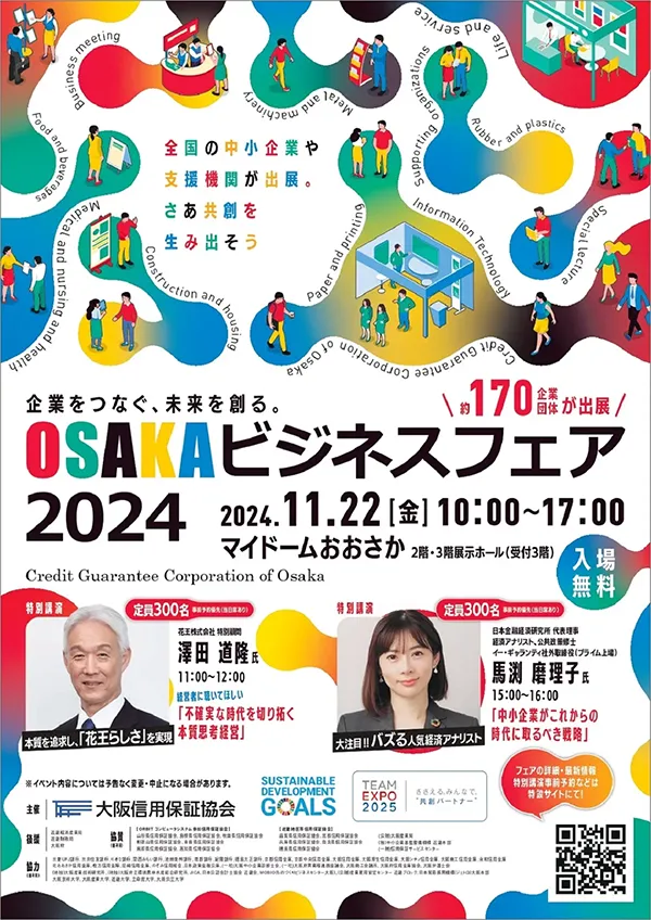 9回目の開催となる本フェアでは、大阪府の内外を問わず様々な分野の中小企業・小規模事業者、公的機関、支援機関、大学など合わせて169の企業・団体にご出展いただき、その魅力を余すところなくPRしていただきます。当日は出展者の方との商談(特設サイトより事前予約可)や、イチオシ製品の展示に加えて、花王㈱特別顧問の澤田道隆氏、経済アナリストの馬渕磨理子氏による特別講演等、皆さまのお役に立つ様々な企画をご用意しております。